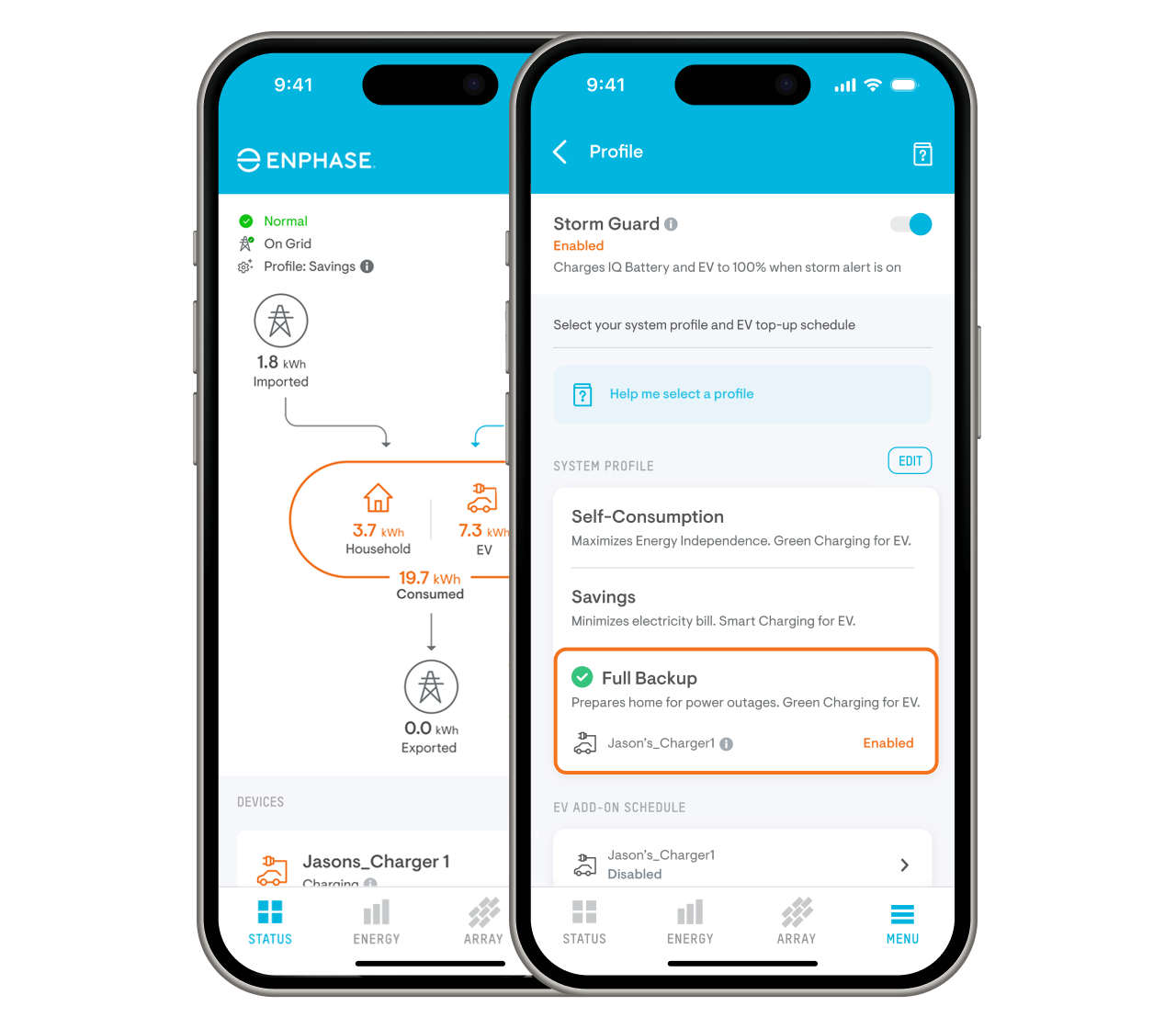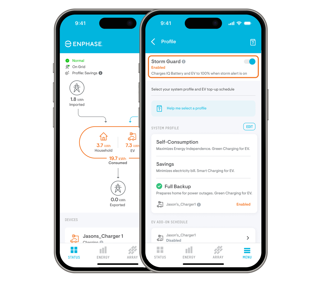 Smart energy management with custom settings that automatically adjust for peak and off-peak times. All-weather reliability keeps your system running with Storm Guard and Full Backup features.